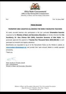 The release further advised participants to log on to the recruitment portal via ministry’s website, www.mobse-abiastategov.ng to provide their bank details for payments.
