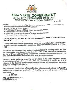 The Abia State Government has expressed dismay over the blatant refusal of some primary and secondary schools in the state to participate in the ongoing Digital Annual School Census which commenced on May, 20, 2025.