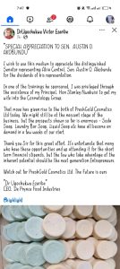 In a post titled, Special Appreciation To Sen. Austine O. Akobundu”, Ugochukwu Victor Ezeribe narrated how he was privileged to participate in the training programme for cosmetology.