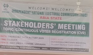 The Resident Electoral Commissioner, REC, for Abia State, Chukwuemeka Ibeziakor made the call on Thursday at a Stakeholders Interactive Meeting at the INEC state headquarters in Umuahia ahead of the commencement of the Continuous Voter Registration (CVR) scheduled to take off on Monday, August 18 for online Pre-registration and 25 for In-person registration.
