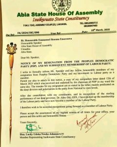 In a letter dated March 18, 2025, and addressed the the Speaker of the house, Rt. Hon. Emmanuel Emeruwa, the lawmaker cited division in the PDP as reason for dumping the party.